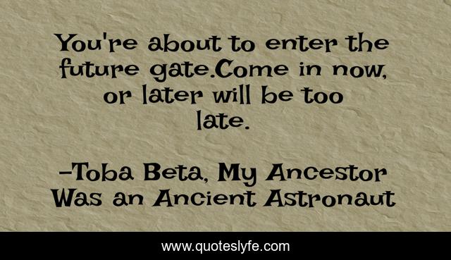 This page presents the quote "You're about to enter the future gate.Come in now, or later will be too late.". Author of this quote is Toba Beta, My Ancestor Was an Ancient Astronaut. This quote is about future, now, enter,.