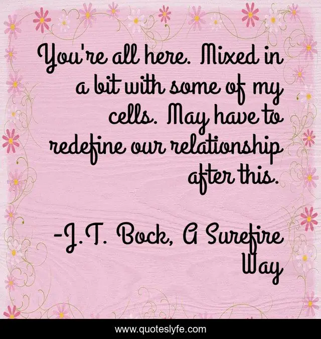 This page presents the quote "You're all here. Mixed in a bit with some of my cells. May have to redefine our relationship after this.". Author of this quote is J.T. Bock, A Surefire Way. This quote is about supernatural, paranormal-romance, superheroes, tags-humor,.