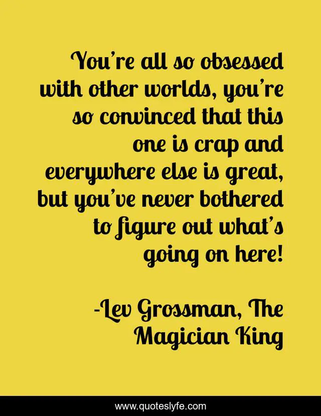 This page presents the quote "You’re all so obsessed with other worlds, you’re so convinced that this one is crap and everywhere else is great, but you’ve never bothered to figure out what’s going on here!". Author of this quote is Lev Grossman, The Magician King. .