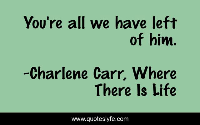 This page presents the quote "You're all we have left of him.". Author of this quote is Charlene Carr, Where There Is Life. This quote is about unlucky-stranded, regrets, lost-love, hurt,.