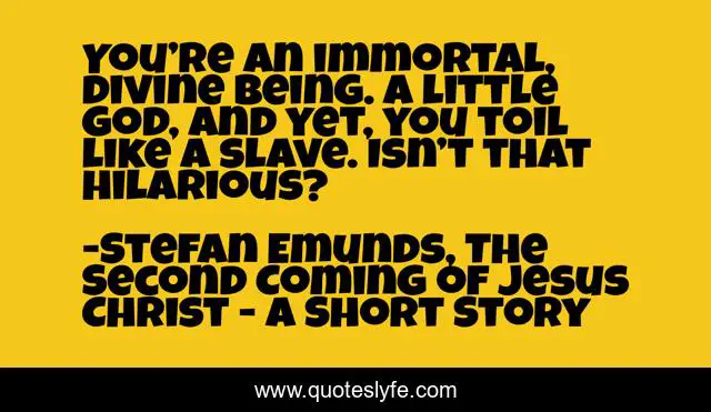 This page presents the quote "You’re an immortal, divine being. A little god, and yet, you toil like a slave. Isn’t that hilarious?". Author of this quote is Stefan Emunds, The Second Coming of Jesus Christ - A Short Story. This quote is about divine-self, second-coming, second-coming-of-christ, revelation, soul-searching, soul, higher-self, revelation-of-self,.