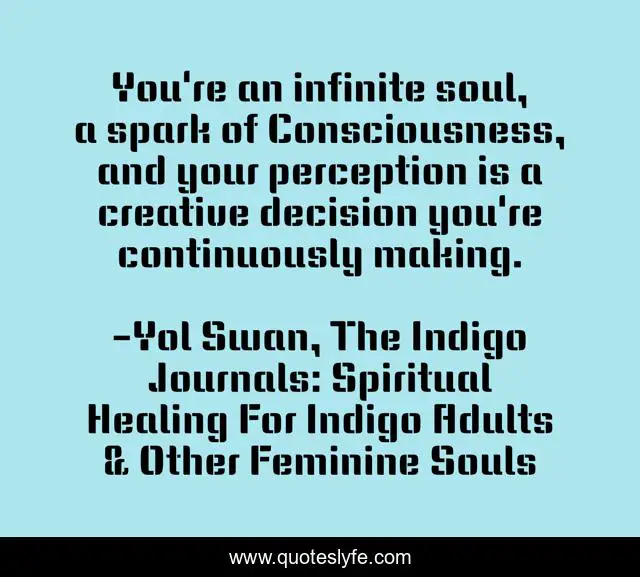 This page presents the quote "You're an infinite soul, a spark of Consciousness, and your perception is a creative decision you're continuously making.". Author of this quote is Yol Swan, The Indigo Journals: Spiritual Healing For Indigo Adults & Other Feminine Souls. This quote is about consciousness, perception, soul, creativity-and-attitude, infinite-soul,.
