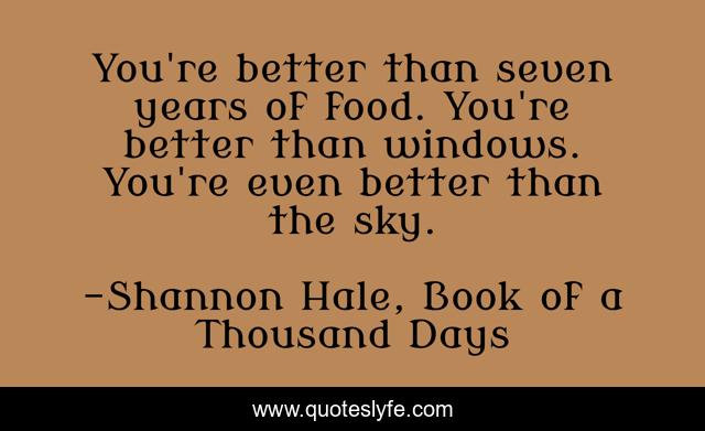 This page presents the quote "You're better than seven years of food. You're better than windows. You're even better than the sky.". Author of this quote is Shannon Hale, Book of a Thousand Days. This quote is about love, affection,.