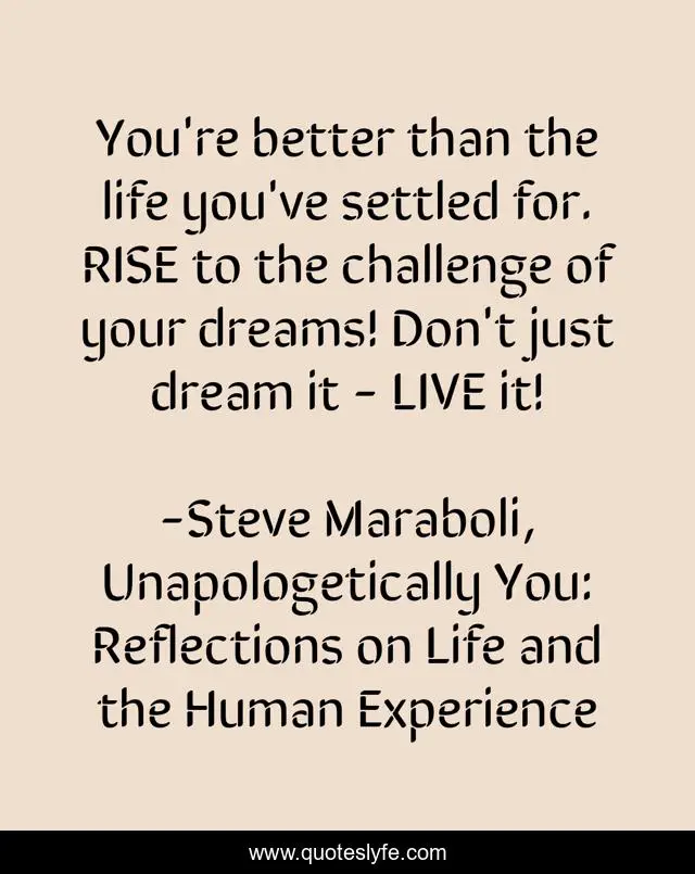 This page presents the quote "You're better than the life you've settled for. RISE to the challenge of your dreams! Don't just dream it - LIVE it!". Author of this quote is Steve Maraboli, Unapologetically You: Reflections on Life and the Human Experience. This quote is about challenges, life, dreams, success,.