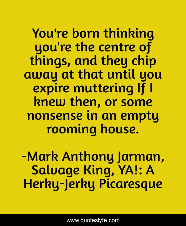 This page presents the quote "You're born thinking you're the centre of things, and they chip away at that until you expire muttering If I knew then, or some nonsense in an empty rooming house.". Author of this quote is Mark Anthony Jarman, Salvage King, YA!: A Herky-Jerky Picaresque. .