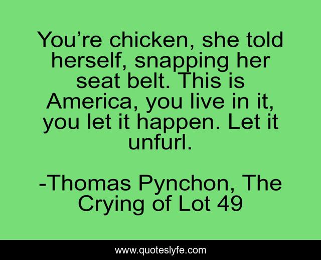 This page presents the quote "You’re chicken, she told herself, snapping her seat belt. This is America, you live in it, you let it happen. Let it unfurl.". Author of this quote is Thomas Pynchon, The Crying of Lot 49. This quote is about america, postmodernism,.
