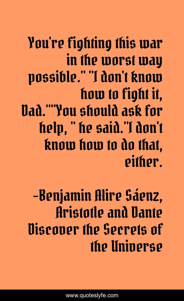 This page presents the quote "You're fighting this war in the worst way possible." "I don't know how to fight it, Dad.""You should ask for help, " he said."I don't know how to do that, either.". Author of this quote is Benjamin Alire Sáenz, Aristotle and Dante Discover the Secrets of the Universe. This quote is about war, fight,.