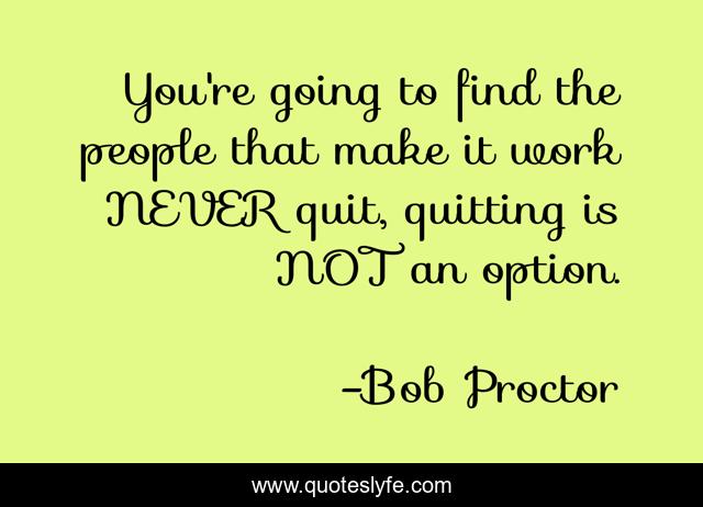 This page presents the quote "You're going to find the people that make it work NEVER quit, quitting is NOT an option.". Author of this quote is Bob Proctor. This quote is about confidence, personal-growth, positive, motivational, optimistic, inspirational, personal-development, enthusiasm, quitting,.
