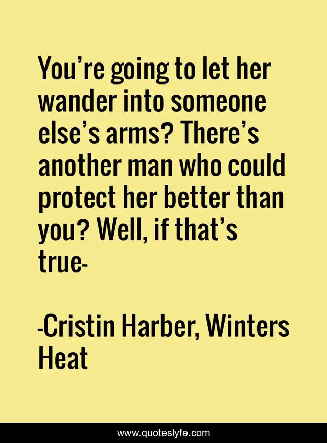 This page presents the quote "You’re going to let her wander into someone else’s arms? There’s another man who could protect her better than you? Well, if that’s true—". Author of this quote is Cristin Harber, Winters Heat. This quote is about alpha-male, military-romance, alpha-hero, dark-moments, romantic-suspense,.