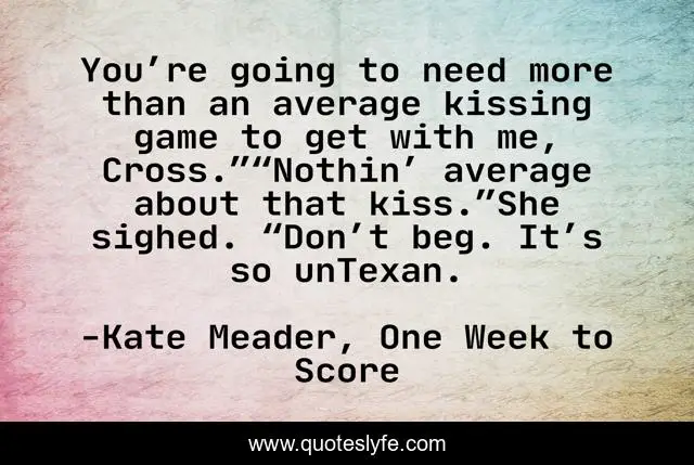This page presents the quote "You’re going to need more than an average kissing game to get with me, Cross.”“Nothin’ average about that kiss.”She sighed. “Don’t beg. It’s so unTexan.". Author of this quote is Kate Meader, One Week to Score. This quote is about texans, tall-dark-and-texan, brazen, kate-meader, kissing, alpha,.