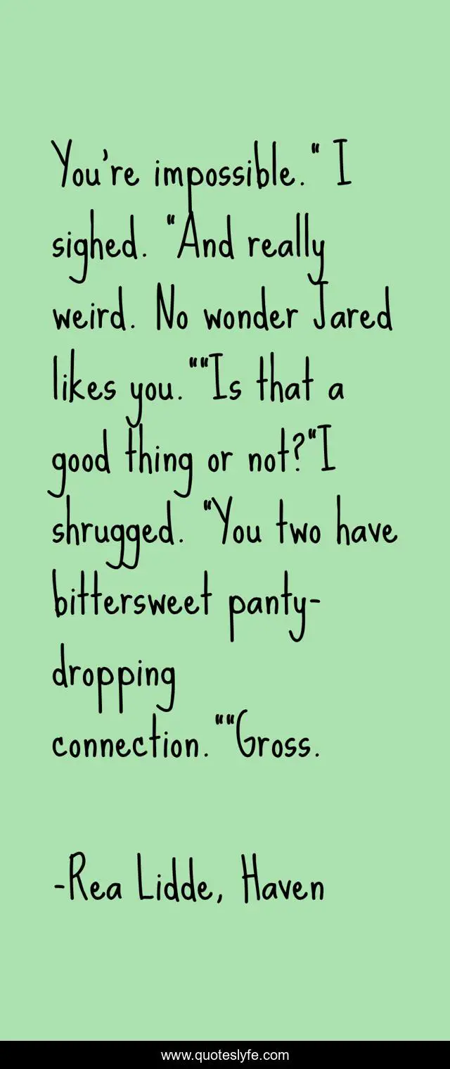 This page presents the quote "You’re impossible.” I sighed. “And really weird. No wonder Jared likes you.”“Is that a good thing or not?”I shrugged. “You two have bittersweet panty-dropping connection.”“Gross.". Author of this quote is Rea Lidde, Haven. This quote is about friends, connection, frienship, humor,.