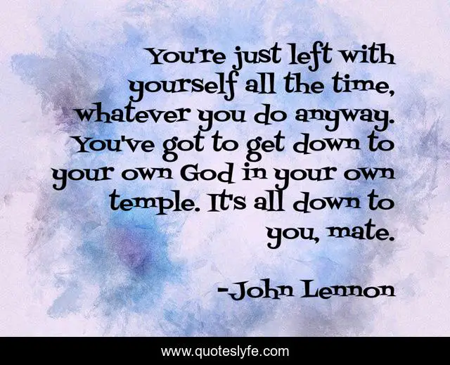 This page presents the quote "You're just left with yourself all the time, whatever you do anyway. You've got to get down to your own God in your own temple. It's all down to you, mate.". Author of this quote is John Lennon. This quote is about time, yourself,.