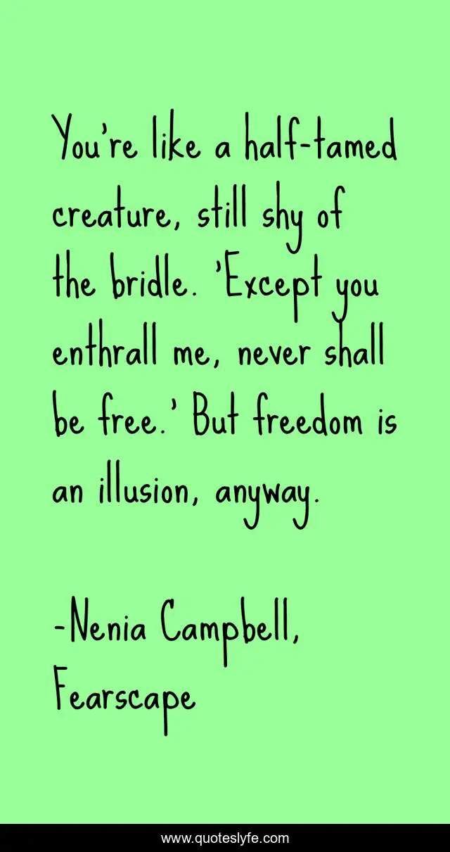 This page presents the quote "You're like a half-tamed creature, still shy of the bridle. 'Except you enthrall me, never shall be free.' But freedom is an illusion, anyway.". Author of this quote is Nenia Campbell, Fearscape. This quote is about scary, dangerous, evil-men, creepy, courtship, dating,.