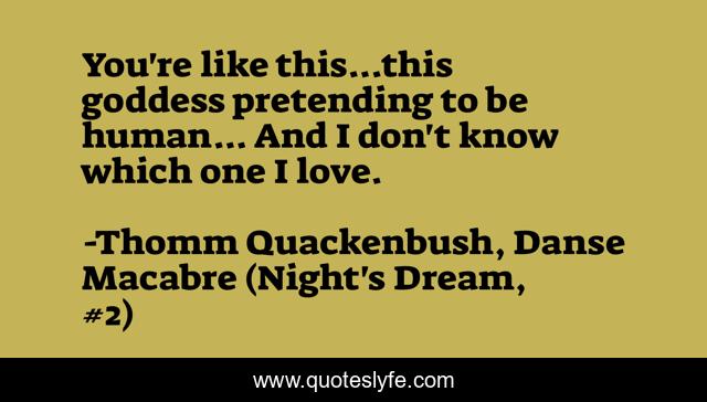 This page presents the quote "You're like this...this goddess pretending to be human... And I don't know which one I love.". Author of this quote is Thomm Quackenbush, Danse Macabre (Night's Dream, #2). This quote is about goddess, love, pretending, affection, human,.