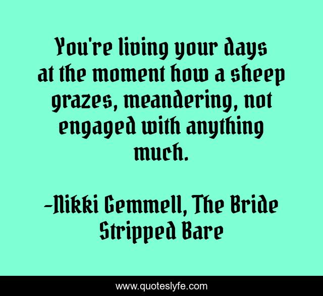 This page presents the quote "You're living your days at the moment how a sheep grazes, meandering, not engaged with anything much.". Author of this quote is Nikki Gemmell, The Bride Stripped Bare. This quote is about anomieta, purpose-of-life, direction,.