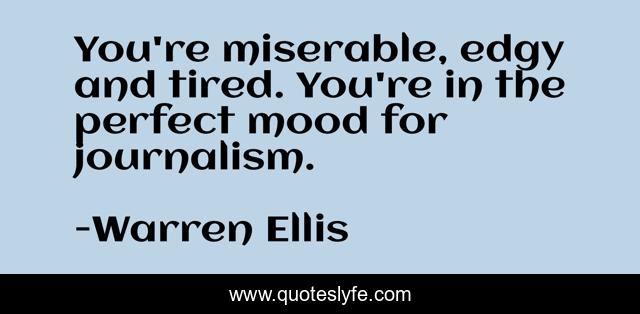 This page presents the quote "You're miserable, edgy and tired. You're in the perfect mood for journalism.". Author of this quote is Warren Ellis. This quote is about journalism, writing,.