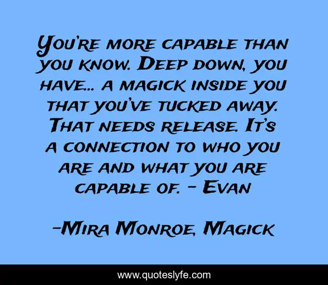 This page presents the quote "You’re more capable than you know. Deep down, you have… a magick inside you that you’ve tucked away. That needs release. It’s a connection to who you are and what you are capable of. - Evan". Author of this quote is Mira Monroe, Magick. This quote is about book, thought-provoking,.