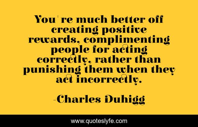 This page presents the quote "You're much better off creating positive rewards, complimenting people for acting correctly, rather than punishing them when they act incorrectly.". Author of this quote is Charles Duhigg. This quote is about better, acting, people,.