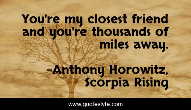 This page presents the quote "You're my closest friend and you're thousands of miles away.". Author of this quote is Anthony Horowitz, Scorpia Rising. This quote is about distance, friendship,.