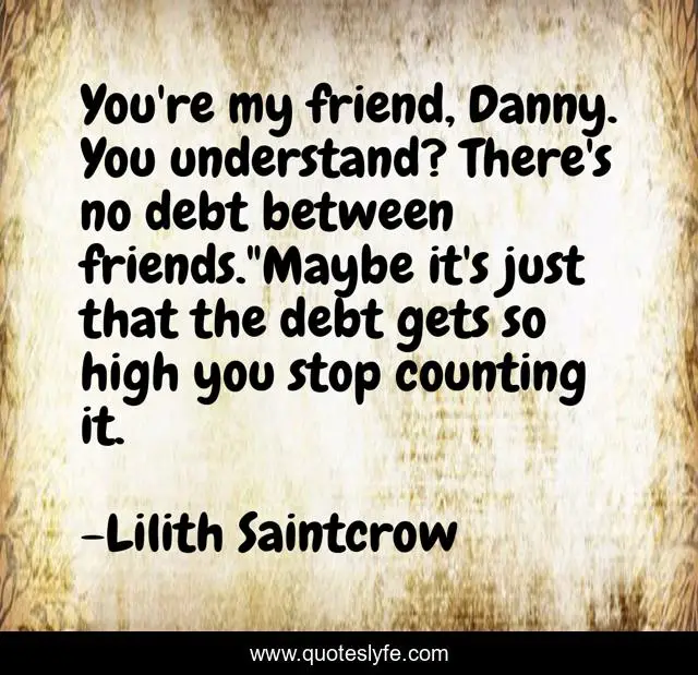 This page presents the quote "You're my friend, Danny. You understand? There's no debt between friends."Maybe it's just that the debt gets so high you stop counting it.". Author of this quote is Lilith Saintcrow. .