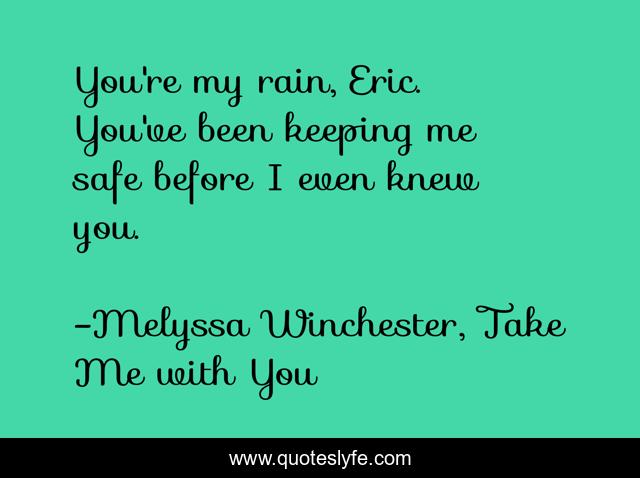This page presents the quote "You're my rain, Eric. You've been keeping me safe before I even knew you.". Author of this quote is Melyssa Winchester, Take Me with You. This quote is about sweet, take-me-with-you, rain, amelia-evans,.