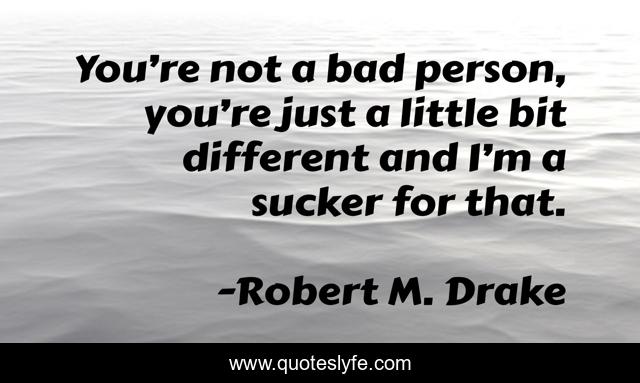 This page presents the quote "You’re not a bad person, you’re just a little bit different and I’m a sucker for that.". Author of this quote is Robert M. Drake. This quote is about lovequotes, sadquotes, poetry, quotes, instadaily, happyquotes, relationships, sayings, writer,.