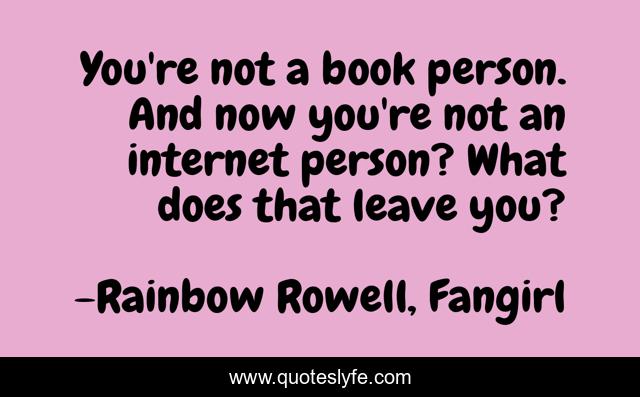 This page presents the quote "You're not a book person. And now you're not an internet person? What does that leave you?". Author of this quote is Rainbow Rowell, Fangirl. This quote is about humor, internet,.