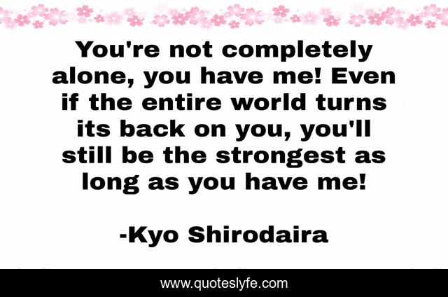 This page presents the quote "You're not completely alone, you have me! Even if the entire world turns its back on you, you'll still be the strongest as long as you have me!". Author of this quote is Kyo Shirodaira. This quote is about enthusiasm, strength, inspirational,.