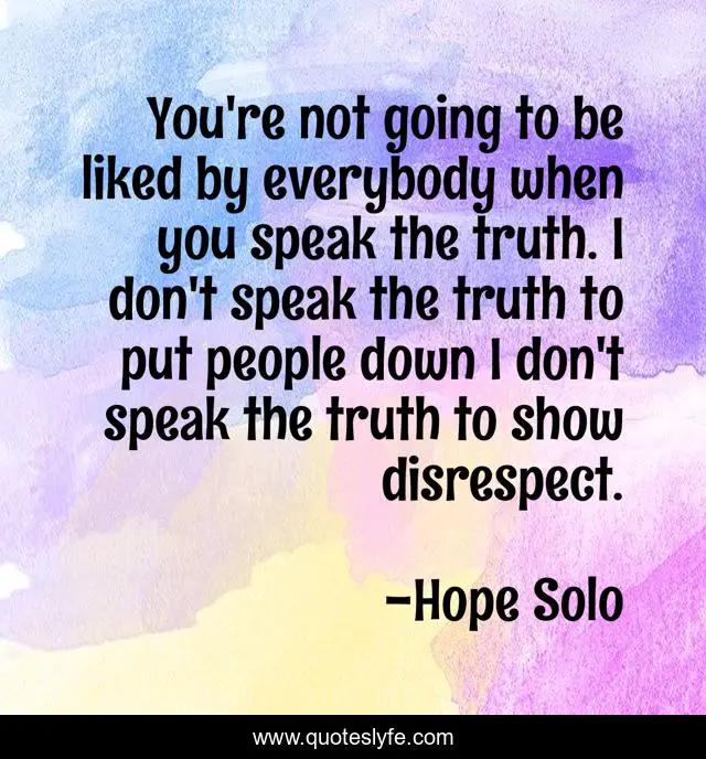 This page presents the quote "You're not going to be liked by everybody when you speak the truth. I don't speak the truth to put people down I don't speak the truth to show disrespect.". Author of this quote is Hope Solo. This quote is about speak, people,.