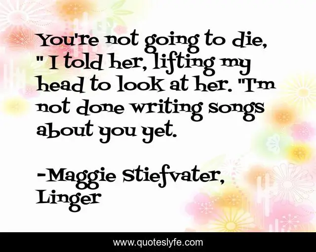 This page presents the quote "You're not going to die, " I told her, lifting my head to look at her. "I'm not done writing songs about you yet.". Author of this quote is Maggie Stiefvater, Linger. This quote is about grace, sam,.