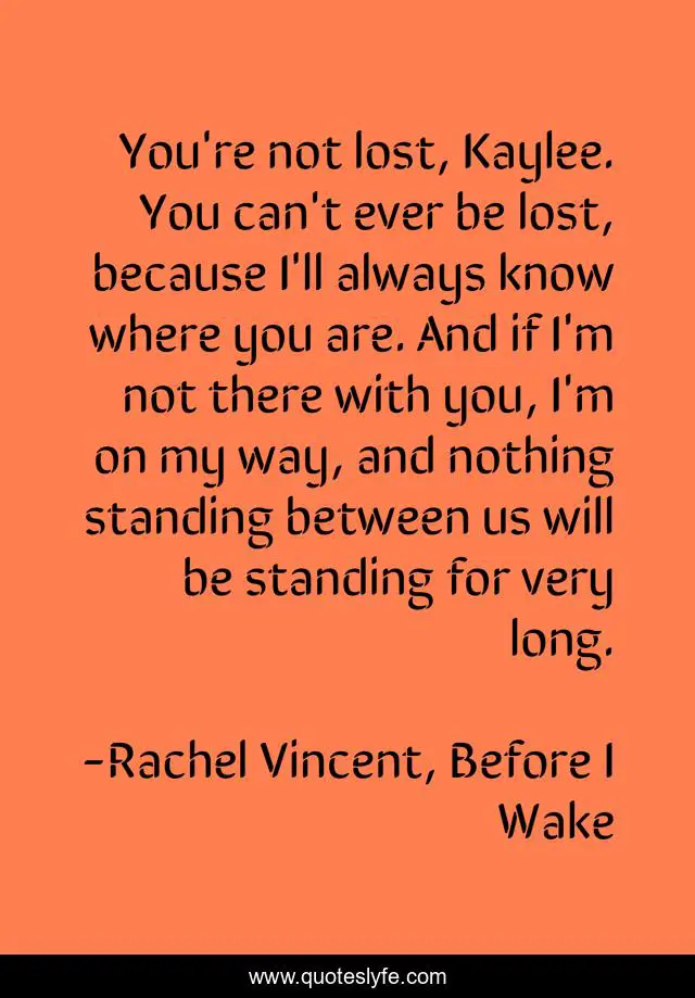 This page presents the quote "You're not lost, Kaylee. You can't ever be lost, because I'll always know where you are. And if I'm not there with you, I'm on my way, and nothing standing between us will be standing for very long.". Author of this quote is Rachel Vincent, Before I Wake. This quote is about love, affection,.