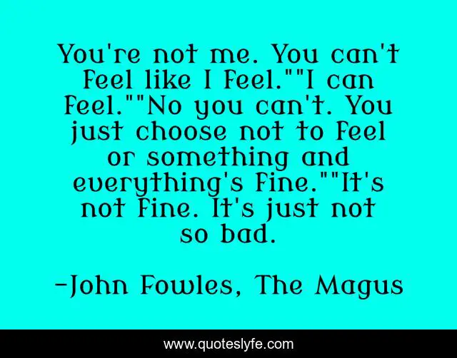 This page presents the quote "You're not me. You can't feel like I feel.""I can feel.""No you can't. You just choose not to feel or something and everything's fine.""It's not fine. It's just not so bad.". Author of this quote is John Fowles, The Magus. .