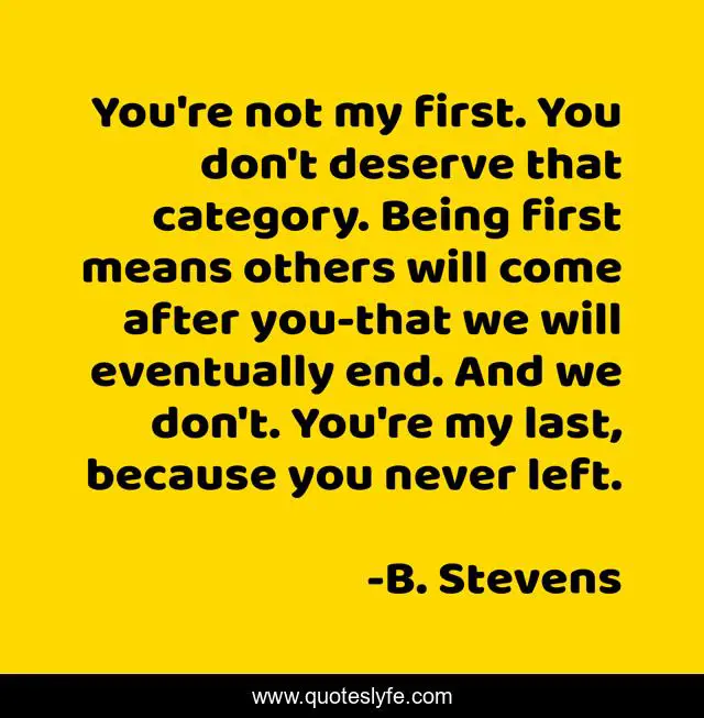 This page presents the quote "You're not my first. You don't deserve that category. Being first means others will come after you-that we will eventually end. And we don't. You're my last, because you never left.". Author of this quote is B. Stevens. This quote is about romance, sweet, love, redemption, affection,.