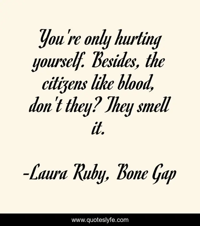 This page presents the quote "You're only hurting yourself. Besides, the citizens like blood, don't they? They smell it.". Author of this quote is Laura Ruby, Bone Gap. This quote is about citizens, smell, blood,.