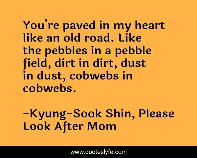 This page presents the quote "You're paved in my heart like an old road. Like the pebbles in a pebble field, dirt in dirt, dust in dust, cobwebs in cobwebs.". Author of this quote is Kyung-Sook Shin, Please Look After Mom. This quote is about heart, still, love, soul, affection,.