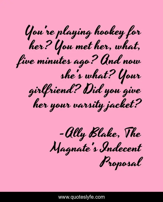 This page presents the quote "You're playing hookey for her? You met her, what, five minutes ago? And now she's what? Your girlfriend? Did you give her your varsity jacket?". Author of this quote is Ally Blake, The Magnate's Indecent Proposal. This quote is about girlfriend, hookey, sarcasm,.