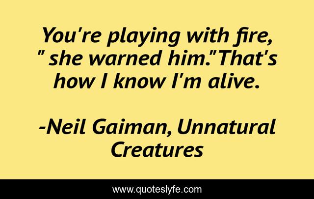 This page presents the quote "You're playing with fire, " she warned him."That's how I know I'm alive.". Author of this quote is Neil Gaiman, Unnatural Creatures. This quote is about fire, alive,.