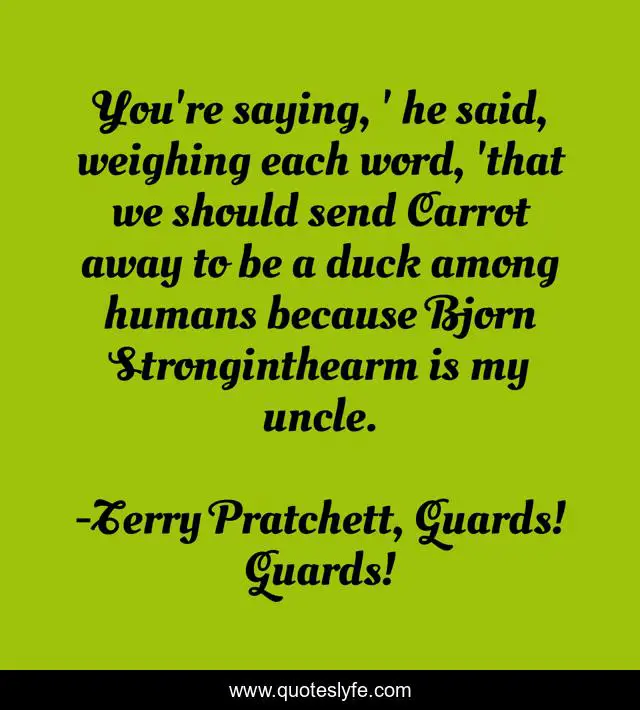 This page presents the quote "You're saying, ' he said, weighing each word, 'that we should send Carrot away to be a duck among humans because Bjorn Stronginthearm is my uncle.". Author of this quote is Terry Pratchett, Guards! Guards!. This quote is about bob-s-your-uncle, metaphor,.