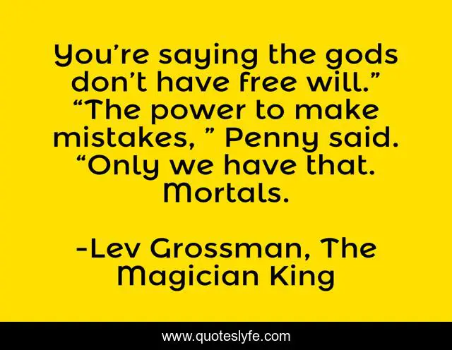 This page presents the quote "You’re saying the gods don’t have free will.” “The power to make mistakes, ” Penny said. “Only we have that. Mortals.". Author of this quote is Lev Grossman, The Magician King. This quote is about free-will, choices,.