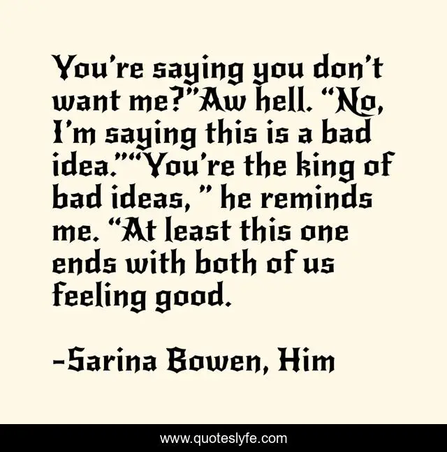 This page presents the quote "You’re saying you don’t want me?”Aw hell. “No, I’m saying this is a bad idea.”“You’re the king of bad ideas, ” he reminds me. “At least this one ends with both of us feeling good.". Author of this quote is Sarina Bowen, Him. This quote is about m-m-romance, him, kiss,.