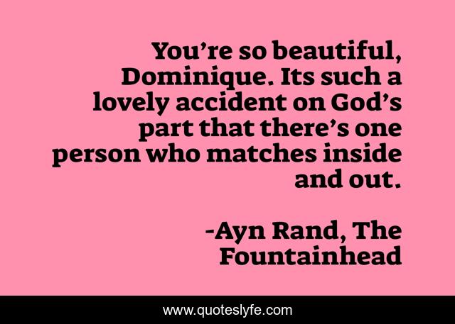 This page presents the quote "You’re so beautiful, Dominique. Its such a lovely accident on God’s part that there’s one person who matches inside and out.". Author of this quote is Ayn Rand, The Fountainhead. This quote is about beautiful, the-fountainhead, gail-wynand, dominique-francon,.