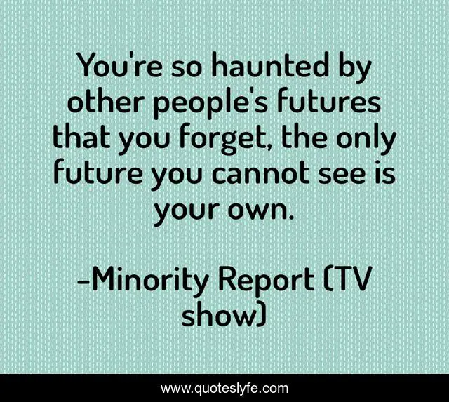 This page presents the quote "You're so haunted by other people's futures that you forget, the only future you cannot see is your own.". Author of this quote is Minority Report (TV show). This quote is about anxiety, parenthood, counseling, education, worry, intervention,.