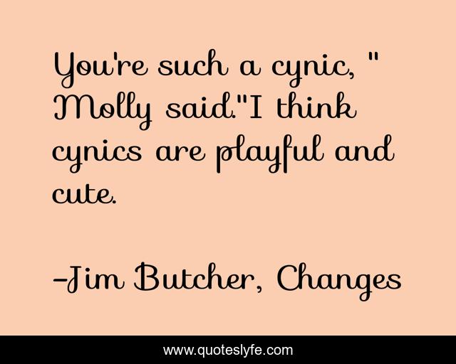 This page presents the quote "You're such a cynic, " Molly said."I think cynics are playful and cute.". Author of this quote is Jim Butcher, Changes. This quote is about molly-carpenter, cynicism, humor, harry-dresden,.