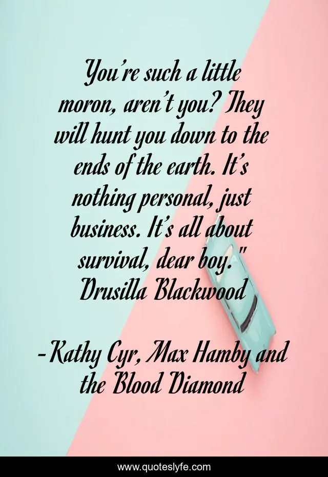 This page presents the quote "You’re such a little moron, aren’t you? They will hunt you down to the ends of the earth. It’s nothing personal, just business. It’s all about survival, dear boy." Drusilla Blackwood". Author of this quote is Kathy Cyr, Max Hamby and the Blood Diamond. This quote is about children, magic, fantasy, max-hamby, book-series, dragon, spriggan, wizards, adventure,.