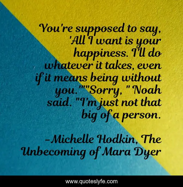 This page presents the quote "You're supposed to say, 'All I want is your happiness. I'll do whatever it takes, even if it means being without you.'""Sorry, " Noah said. "I'm just not that big of a person.". Author of this quote is Michelle Hodkin, The Unbecoming of Mara Dyer. This quote is about michelle-hodkin, romance, mara-dyer, noah-shaw,.