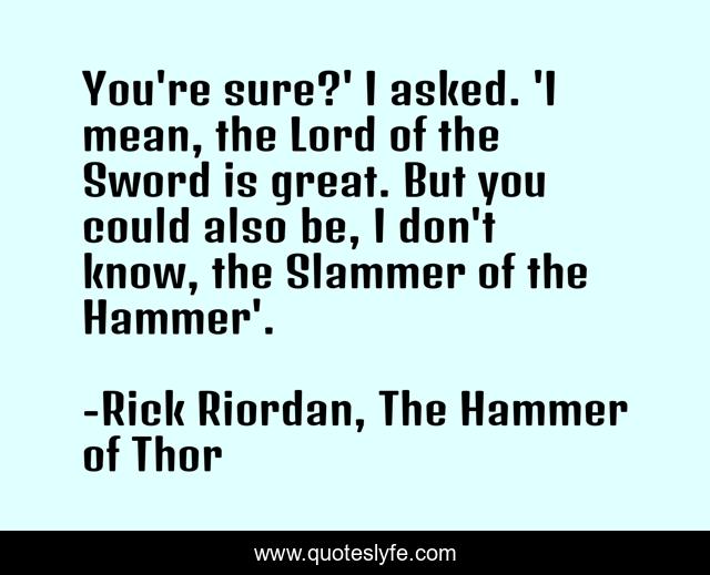 This page presents the quote "You're sure?' I asked. 'I mean, the Lord of the Sword is great. But you could also be, I don't know, the Slammer of the Hammer'.". Author of this quote is Rick Riordan, The Hammer of Thor. .