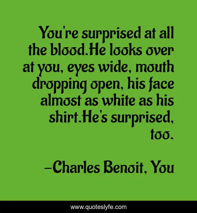 This page presents the quote "You're surprised at all the blood.He looks over at you, eyes wide, mouth dropping open, his face almost as white as his shirt.He's surprised, too.". Author of this quote is Charles Benoit, You. This quote is about charles-benoit, opening-lines, blood,.