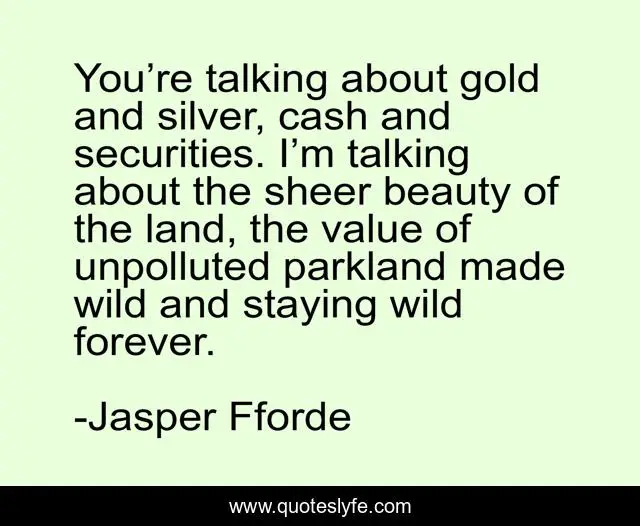 This page presents the quote "You’re talking about gold and silver, cash and securities. I’m talking about the sheer beauty of the land, the value of unpolluted parkland made wild and staying wild forever.". Author of this quote is Jasper Fforde. This quote is about environment, inspiration, nature,.