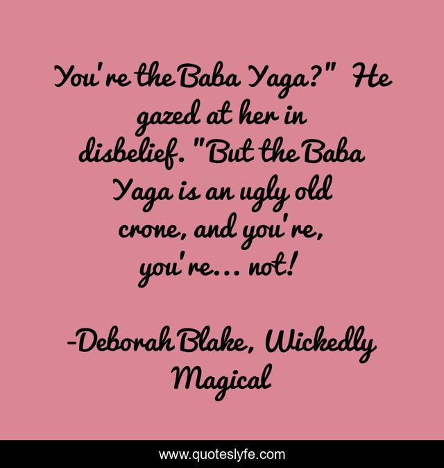 This page presents the quote "You're the Baba Yaga?" He gazed at her in disbelief. "But the Baba Yaga is an ugly old crone, and you're, you're... not!". Author of this quote is Deborah Blake, Wickedly Magical. This quote is about magic, paranormal, dragons, fractured-folk-tale, motorcycle, witches, underworld, russian-folklore,.