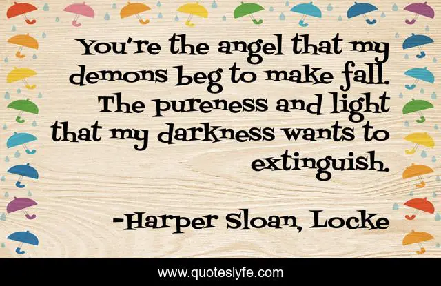 This page presents the quote "You’re the angel that my demons beg to make fall. The pureness and light that my darkness wants to extinguish.". Author of this quote is Harper Sloan, Locke. This quote is about angel, love, darkness, affection, demons,.